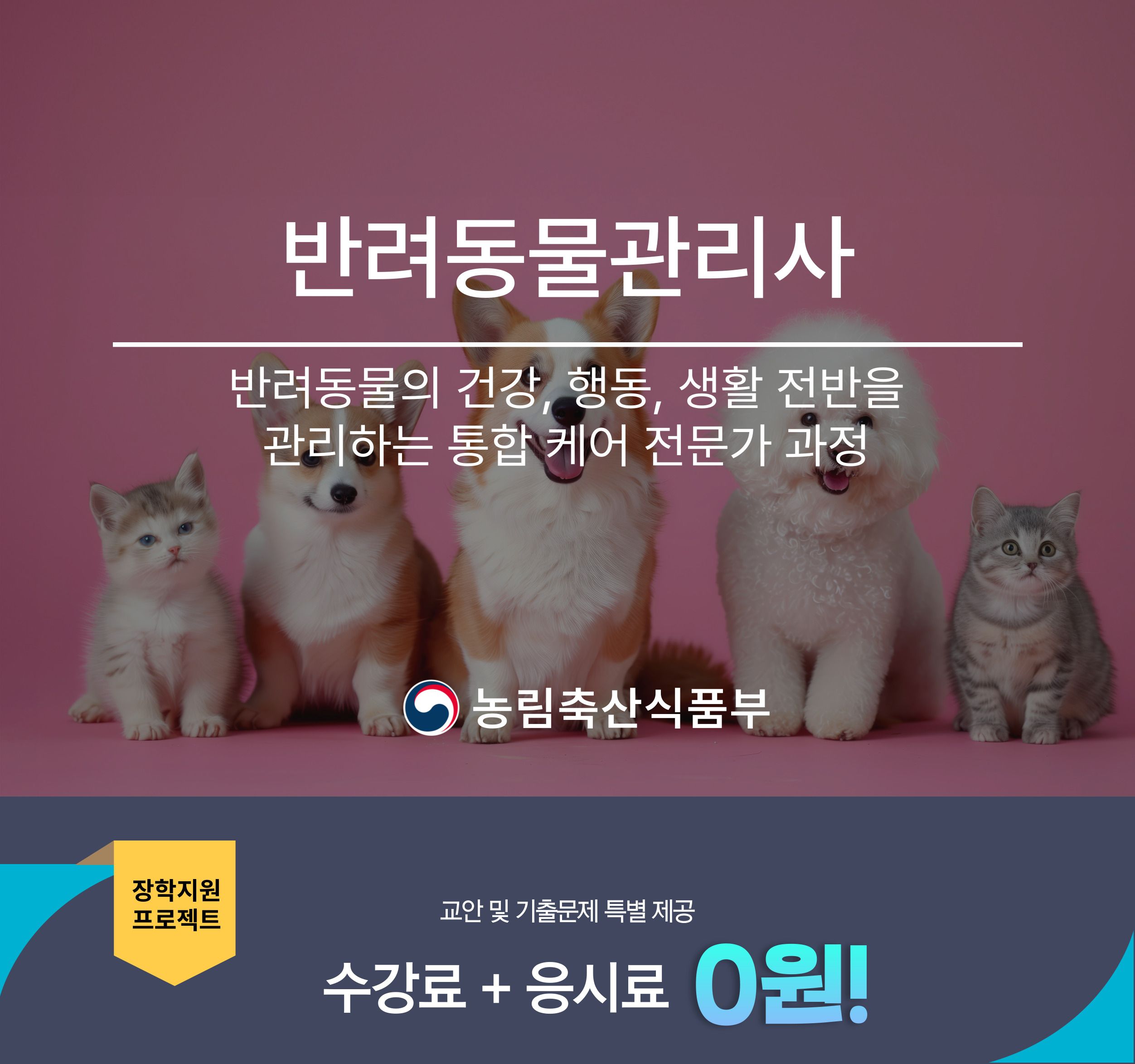 본 과정은 반려동물 관리의 기본 개념부터 건강 관리, 행동 이해, 위생 관리, 상황별 대응 방법까지 실무 중심으로 구성되어 있으며 단기간 내 이론 학습을 통해 자격증 취득이 가능하도록 설계되었습니다.